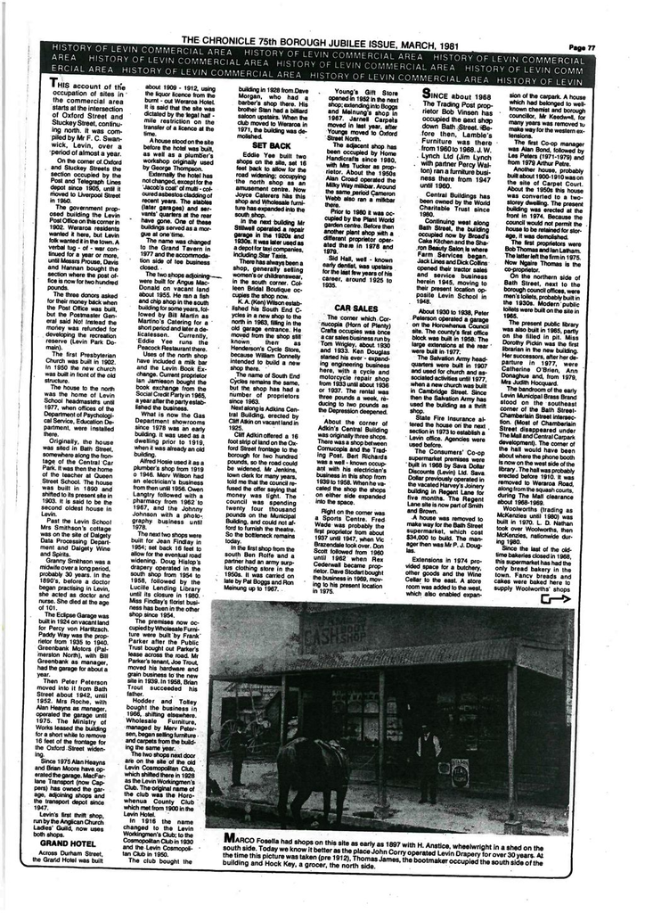 This account of the occupation of sites in the commercial area starts at the intersection of Oxford Street and Stuckey Street, continuing north. It was compiled by Mr F. C. Swanwick, Levin, over a period of almost a year.