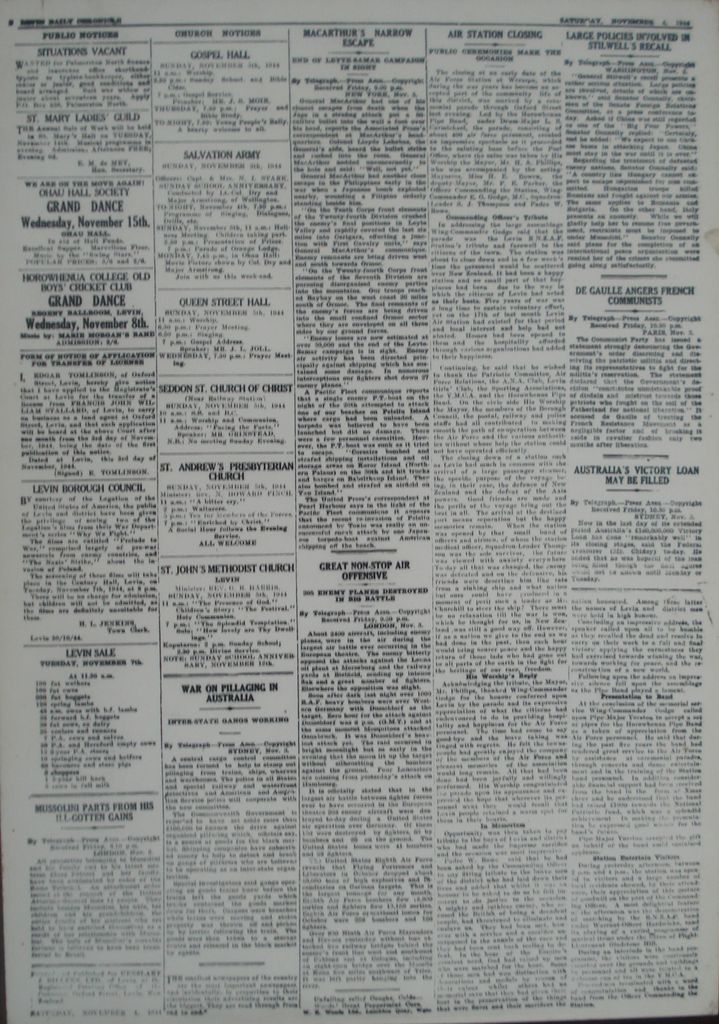 Column 1 (left) – Public Notices & article: Mussolini parts from his ill-gotten gains. Column 2 – Church Notices & article: War on pillaging in Australia. Column 3 – 2 articles: MacArthur’s Narrow Escape. & Great Non-stop Air Offensive. Column 4 – 1 article: Air Station Closing. (continues bottom of column 5) Column 5 – 3 articles: Large policies involved in Stilwell’s recall. & De Gaulle angers French Communists. & Australia’s Victory Loan may be filled.