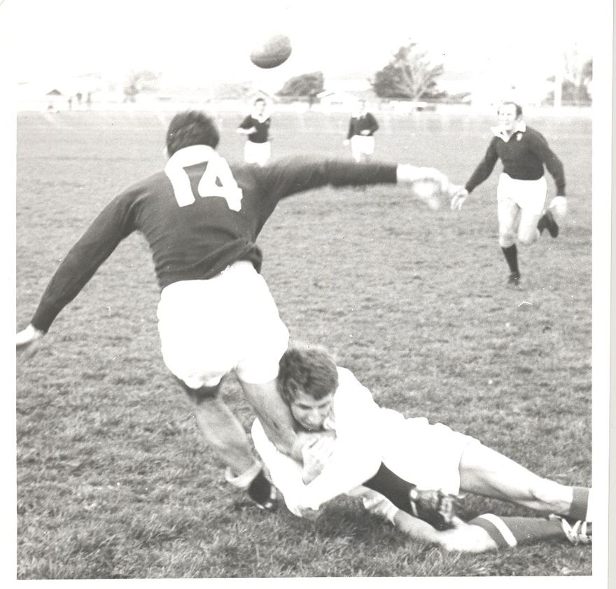 Mr R. Gray (Wellington Centurians) getting the ball away as he is tackled by K. Gray. 1 B&W photo print