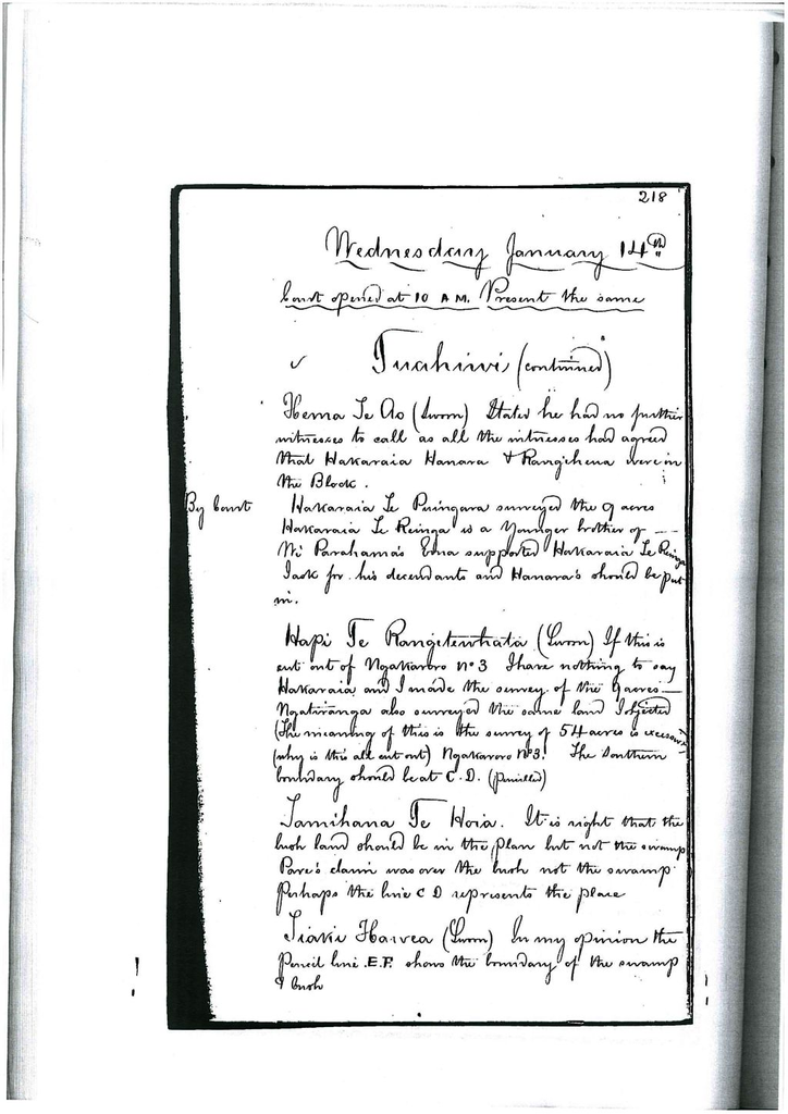 We are Ngati Huia’s and have a title to No. 3. I am clear as to width of swamp. The survey of 54 acres was made in 1874. I dragged the chain. Ngati Huia and Ngati Pare agreed on the ground to these lines. Pare was represented by Kipa Karepa and Te Metera represented Ngati Huia and agreed to the lines for the 54 acres. I am sure the south line runs all through the swamp.