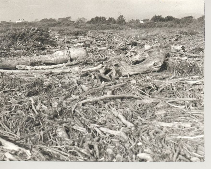 Large pile of driftwood above hightide level against low dunes. 1 B&W photo print