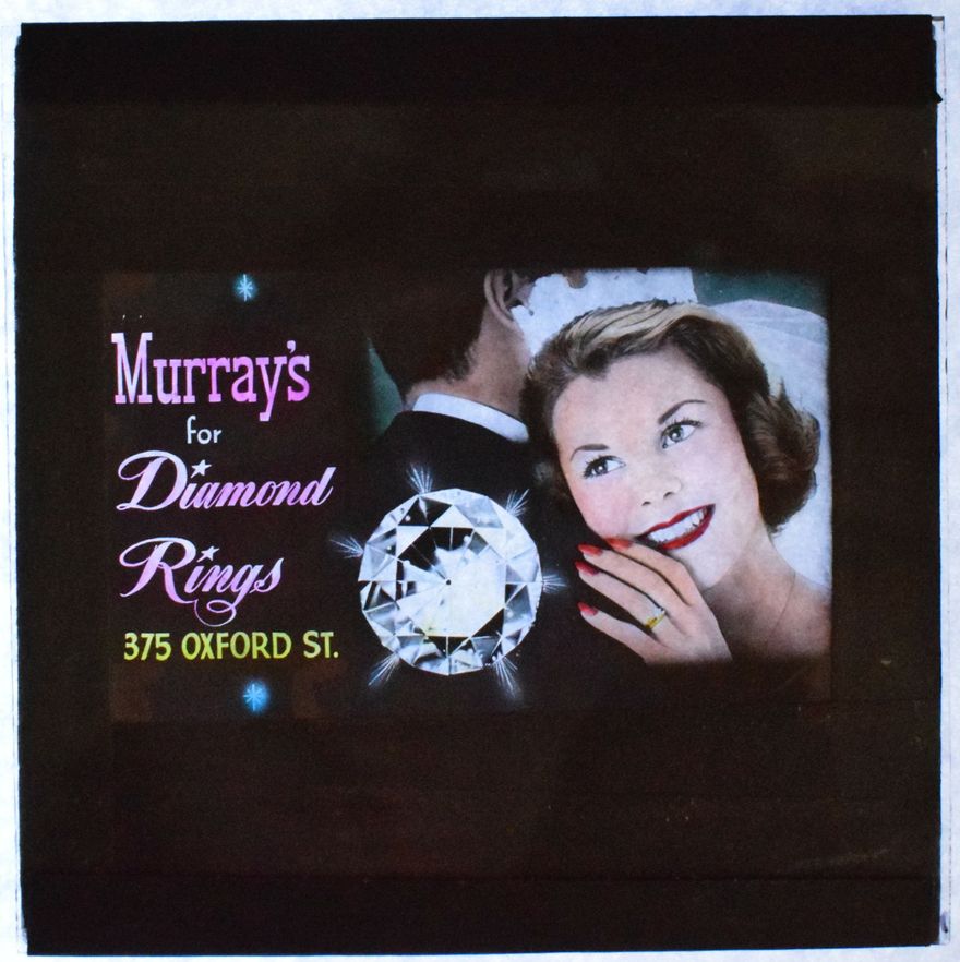Many cinema advertising slides of the 1950s and 1960s showcased the wedding industry and this one focuses on a very important part of the ceremony- the ring!
