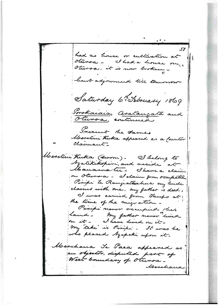 I oppose the claim of Horima and party to this land, they have no right to it. This lands belongs to me, and to those who claim with me. We claim from our ancestor Tireo, we are descended from him. The Maikuku o Rangiwetea is a Kahikatea tree where Rangiwetea a descendant of his used to snare tuis.