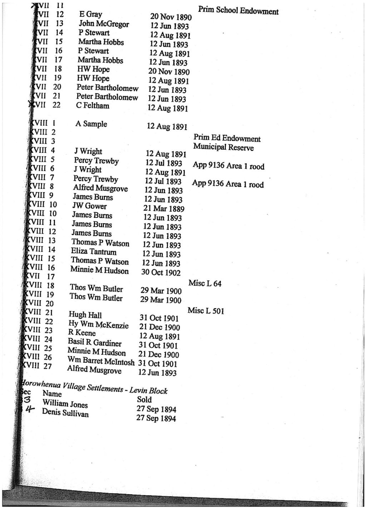 12 Jun 1893 XVIII 16 Minnie M Hudson 30 Oct 1902 XVIII 17 Misc L 64 XVIII 18 Thos Wm Butler 29 Mar 1900 XVIII 19 Thos Wm Butler 29 Mar 1900 XVIII 20 Misc L 501 XVIII 21 Hugh Hall 31 Oct 1901 XVIII 22 Hy Wm McKenzie 21 Dec 1900 XVIII 23 R Keene 12 Aug 1891 XVIII 24 Basil R Gardiner 31 Oct 1901 XVIII 25 Minnie M Hudson 21 Dec 1900 XVIII 26 Wm Barret McIntosh 31 Oct 1901 XVIII 27 Alfred Musgrove 12 Jun 1893 Horowhenua Village Settlements - Levin Block: