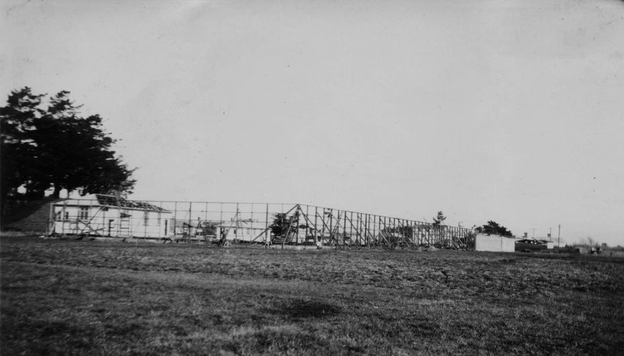 Construction of Woolpack and Textiles factory 1933. This photograph shows the outside wall frames of the main building.