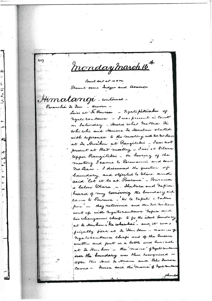 I went to Wellington to keep Rangitikei. Went to Parakaia’s lawyer and the ‘runanga’. Went to Mr. Buller to talk about – Haumiaroa – a part of Awahou block sold to government – asked for money as Winiata had received some. Mr. Buller commenced to talk about Rangitikei and produced deed. Asked me to sign. He wrote my name but I did not sign.