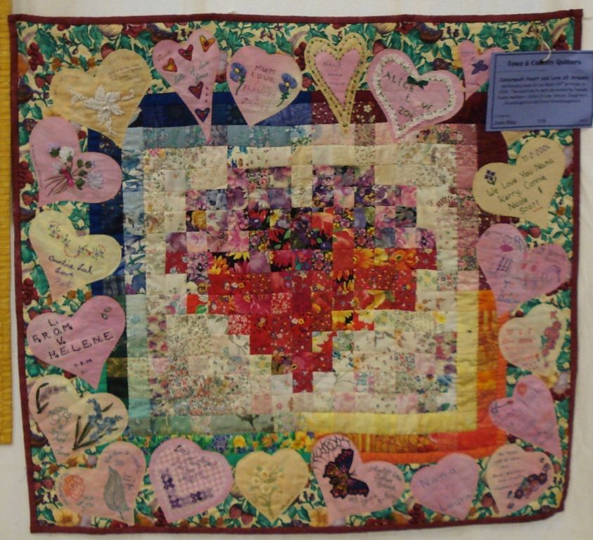 "Wallhanging made for my Mum's 90th birthday in 2004. The small hearts were decorated by female family members - sister-in-law, nieces, daughters, Granddaughters and Great Granddaughters." By Josie Bliss.