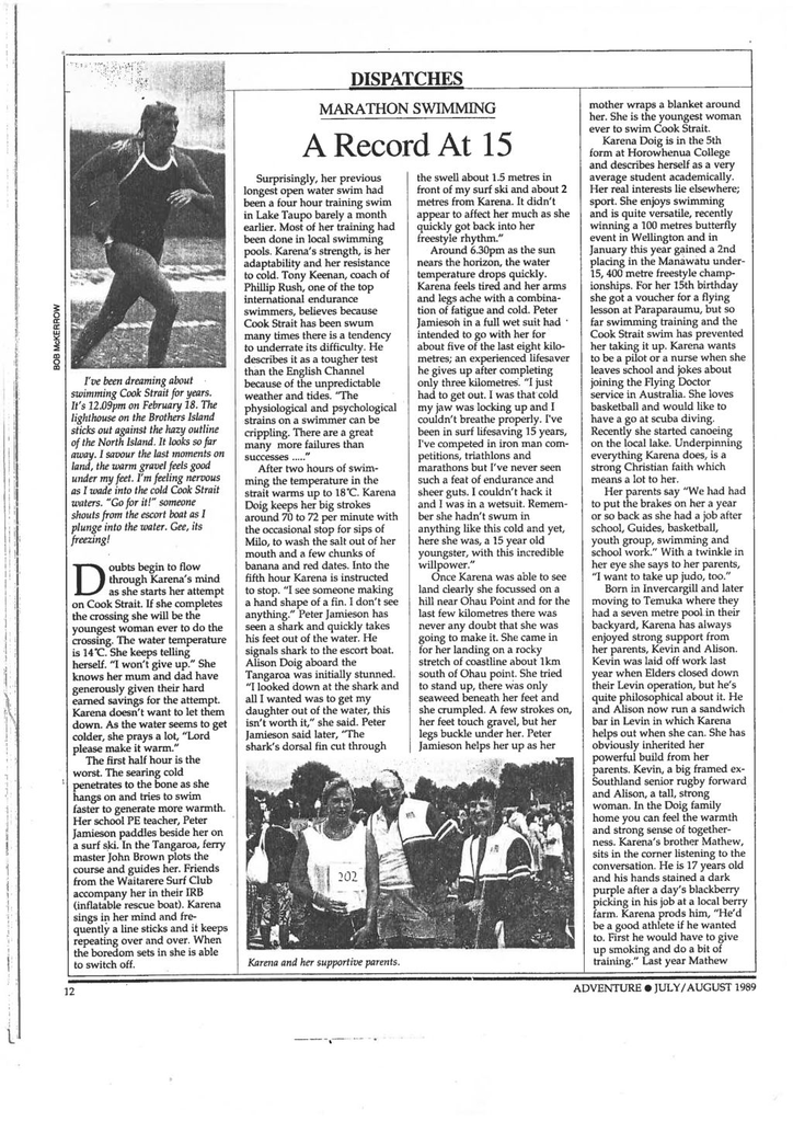 At 15, she has many dreams. Her childhood dream of swimming Cook Strait is now fact. Other dreams embrace competing in the Olympics and paragliding. Her coaches, Leslie Parkin and Steve Prescott, both believe she has a big future in endurance swimming. Steve, who is an endurance swimmer himself, says, "Karena's dogged determination, strong build and natural ability gives her a clear advantage over other swim-mers."