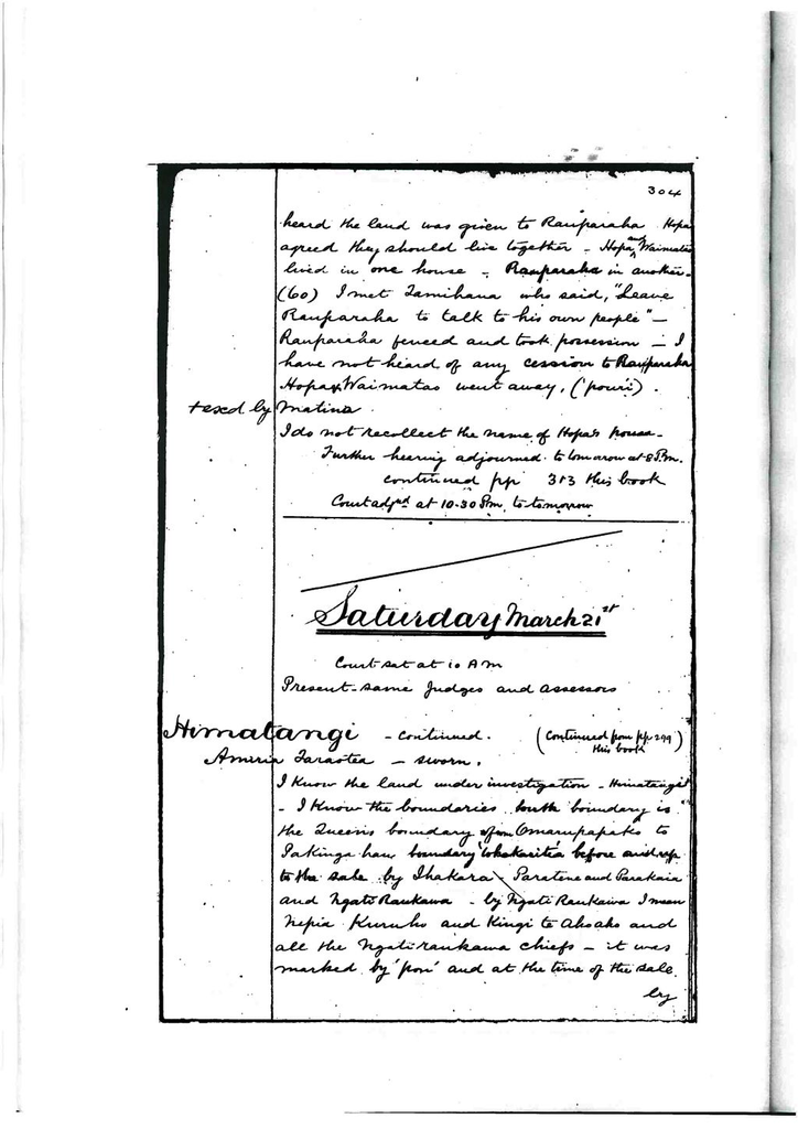I know the land under investigation — Himatangi’s — I know the boundaries south boundary is the queens boundary from Omarupapako to Pakingahau boundary ‘whakaritea’ before and up to the sale by Ihakara — Paratene and Parakai and Ngatirauakawa — by Ngatiraukawa I mean Nepia Kuruho and Kingi Te Ahoaho and all the Ngatiraukawa chiefs — it was marked by ‘pou’ and at the time of the salePage 305