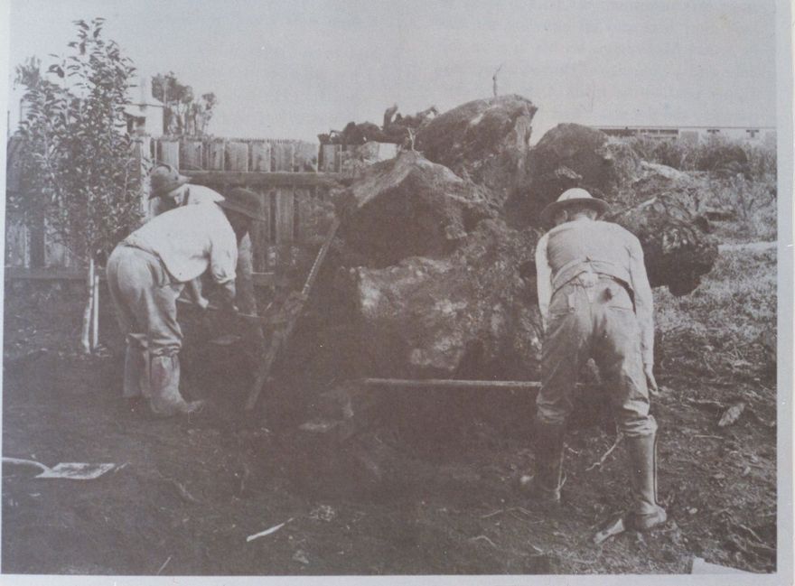 Old Rimu Stump being removed at "Cheslyn Rise" (Levin) in 1899