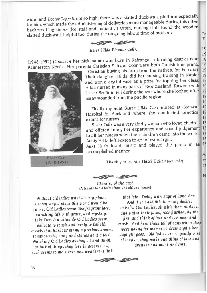 (1948-1952) (Gretchen her nick name) was born in Kairanga, a farming district near lc Palmerston North. Her parents Christian & Inger Cohr were both Danish immigrants - Christian buying his farm from the natives, (as he said). Their daughter Hilda did her nursing training in Napier lc and won a crystal vase as a prize for topping her class. Hilda nursed in many parts of New Zealand. Rawene with Doctor Smith in Fiji during the war where she looked after many wounded from the pacific region.Finally my aunt Sister Hilda Cohr nursed at Cornwall Hospital in Auckland where she conducted practical exams for nurses.