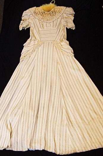 1 cream wedding dress, shot through with gold lurex threads to form stripes. Has short sleeves and a rounded neck , a lace yoke and lace trimmed peplums on each side.