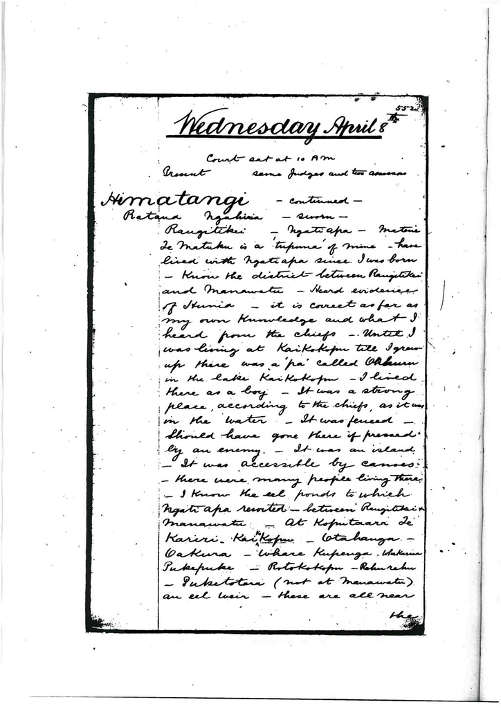 I was a boy at the time about 3 feet high. I know all the eel ponds named by me. I and my father’s have taken eels there. The Ngatiraukawa who I heard, went to Oahuru, went to catch eels there. I don’t know where Matene Te Matuku was when Ngatiraukawa began to cultivate on the Manawatu between Whitirea and Moutoa.