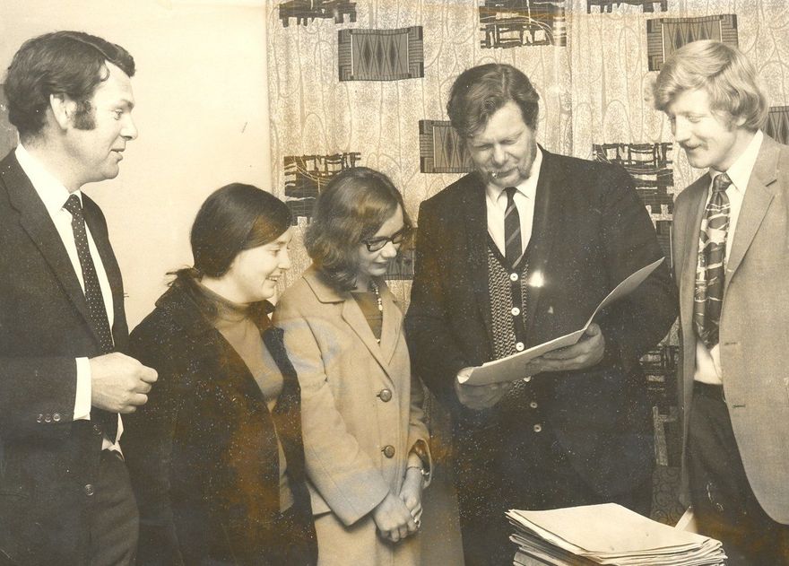 Left to Right - Mr D.J. McDonald (one of the extension course lecturers). Miss Newton Broad & Mrs Vickery (2 students involved in the survey). Mr Warr & Mr G.L. Hermansson (the other course lecturer).