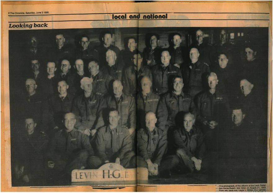 This photograph of the officers of the Levin Battallion Home Guard, was taken on August 21, 1943. From left, hacksaw: Lieuts L. Wilton, H.J. Lancaster, G.W. Munford, J.J. Bebbington, A.A. Savell, J. Sciascia, G.J. Wilde (A.F. C.) W.A.S. Penny, Capt. C.E.C. Webb.