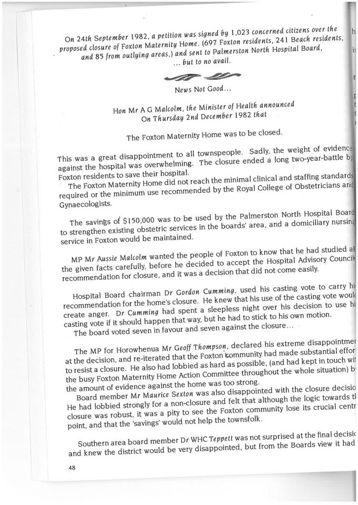 On 24th September 1982, a petition was signed by 1,023 concerned citizens over the proposed closure of Foxton Maternity Home. (697 Foxton residents, 241 Beach residents, and 85 from outlying areas,) and sent to Palmerston North Hospital Board,
