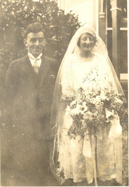Tom and Dot Sunley (nee Dorothy Dean) on their wedding day, at Dean’s Homestead, now Totara Lodge, Devon Street, Levin. 25th December 1924.