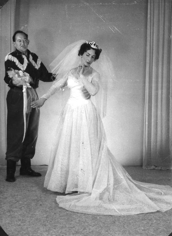 Glen Herbert as Emile La Flamme (left) and Claire Tollan as his sister, Rose Marie La Flamme (right) wearing wedding gown.