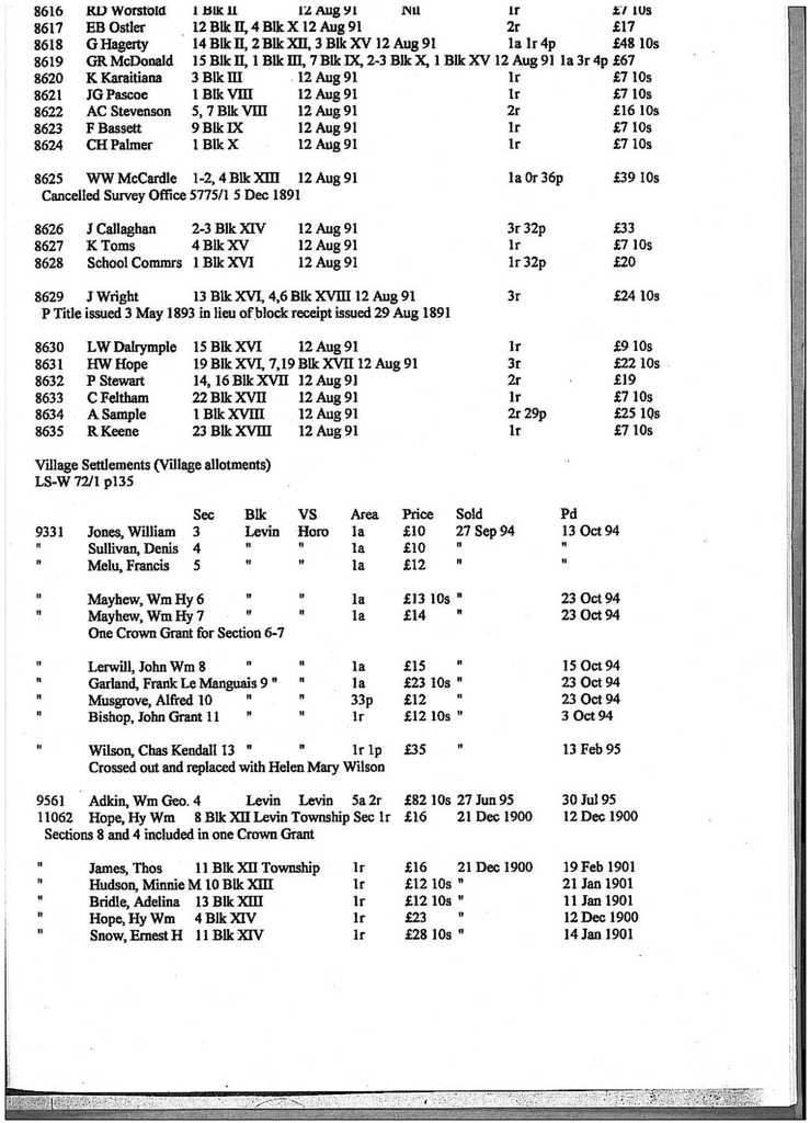 App Name Sec Sold Area Price 8630 LW Dalrymple 15 Blk XVI 12-Aug-91 1r £9 10s 8631 HW Hope 19 Blk XVI, 7,19 Blk XVII 12-Aug-91 3r £22 10s 8632 P Stewart 14, 16 Mk XVII 12-Aug-91 2r £19 8633 C Feltham 22 Blk XVII 12-Aug-91 1r £7 10s 8634 A Sample 1 Blk XVIII 12-Aug-91 2r 29p £25 10s 8635 R Keene 23 Blk XVIII 12-Aug-91 1r £7 10s Village Settlements (Village allotments) - LS-W 72/1 p135 App Name Sec Blk VS Area Price Sold Pd 9331 Jones, William 3 Levin Horo 1a £10 27-Sep-94 13-Oct-94 9331 Sullivan, Denis 4 Levin Horo 1a £10 27-Sep-94 13-Oct-94 9331 Melu, Francis 5 Levin Horo 1a £12 27-Sep-94 13-Oct-94 9331 Mayhew, Wm Hy 6 Levin Horo 1a £13 10s 27-Sep-94 23-Oct-94 9331 Mayhew, Wm Hy 7 Levin Horo 1a £14 27-Sep-94 23-Oct-94 One Crown Grant for Section 6-7 9331 Lerwill, John Wm 8 Levin Horo 1a £15 27-Sep-94 15-Oct-94 9331 Garland, Frank Le Manguais 9 Levin Horo 1a £23 10s 27-Sep-94 23-Oct-94 9331 Musgrove, Alfred 10 10 Levin Horo 33p £12 27-Sep-94 23-Oct-94 9331 Bishop, John Grant 11 Levin Horo 1a £12 10s 27-Sep-94 3-Oct-94 9331 Wilson, Chas Kendall 13 Levin Horo 1a 1p £35 27-Sep-94 13-Feb-95 Crossed out and replaced with Helen Mary Wilson 9561 Adkin, Wm Geo. 4 Levin Levin 5a 2r £82 10s 27-Jun-95 30-Jul-95 11062 Hope, Hy Wm 8 Blk XII Levin Township Sec 1r £16 21-Dec-00 12-Dec-00 Sections 8 and 4 included in one Crown Grant 11062 James, Thos 11 Blk XII Township 1r £16 21-Dec-00 19-Feb-01 11062 Hudson, Minnie M 10 Blk XIII 1r £12 10s 21-Dec-00 21-Jan-01 11062 Bridle, Adelina 13 BIk XIII 1r £12 10s 21-Dec-00 11-Jan-01 11062 Hope, Hy Wm 4 Blk XIV 1r £23 21-Dec-00 12-Dec-00 11062 Snow, Ernest H 11 Blk XIV 1r £28 10s 21-Dec-00 14-Jan-01