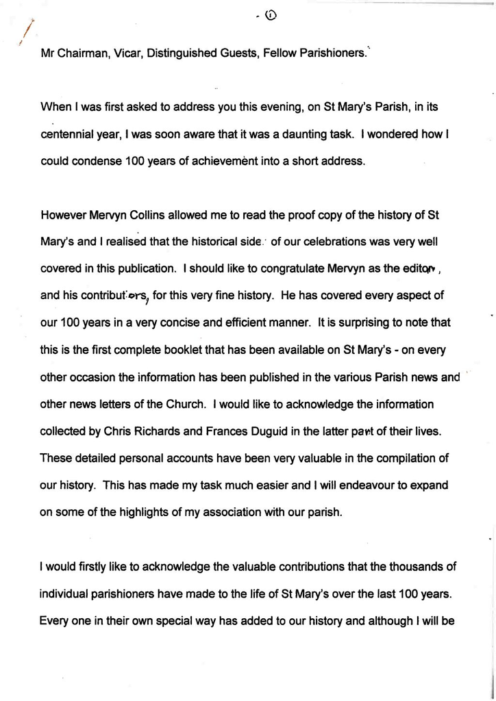 I would firstly like to acknowledge the valuable contributions that the thousands of individual parishioners have made to the life of St Mary's over the last 100 years. Everyone in their own special way has added to our history and although I will be mentioning some people in my address this in no way detracts from the contributions made by others.