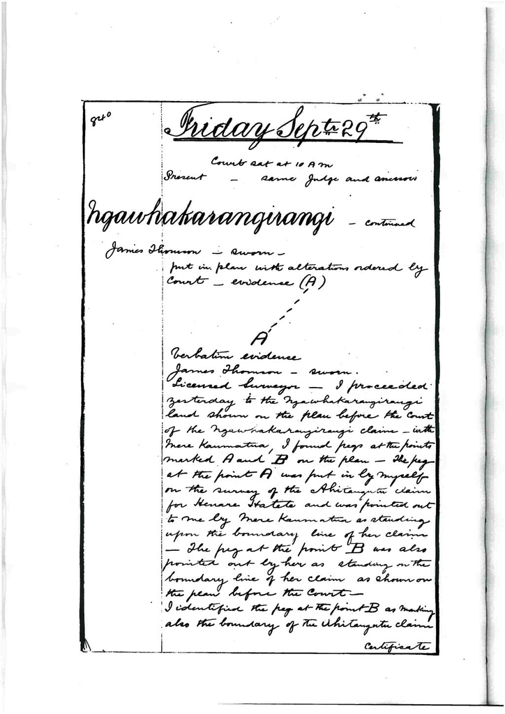 I proceeded to the ground yesterday in company with Perenara and Tiemi Ranapiri and marked off the portion claimed by Perenara. The portion cut off is that now shown upon the plan before the court. The boundaries have been marked by lock spits on the ground. Perenara undertaking to put in pegs.