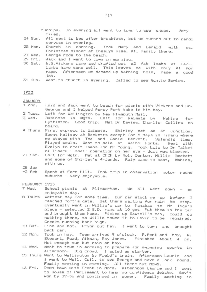 Went to see Murray Roberts catalogue sold - my wool only reached 15a and was sold. (Brokers valuation 15 1/2 - 16). Went up to College in afternoon to see George. Pictures with Edith. Alice and Pero in evening. Dec. 9 Sun. Church in morning. Days Bay with Edith and George to see Kate who is staying over there. Oriental Bay in evening. Dec. 10 Mon. Back home by N.P. Mail. Travelled with Mary Denton. Dec. 13 Thurs. Benefit picture for school picnic. Shirley and I went. Dec. 14 Fri. George returned from school. Won Maths and Science prize. Shirley met train. W.G.Vickers came up to breakfast and to draft lambs. Dec. 18 Tues. We all went to town. School shop day for picnic fund. Only fairly successful - I took 3/7/- at weight guessing competition - total weight of members of committee. Dec. 22 Sat. George and I finished drilling swedes. Afternoon we all went to town. My birthday party in evening. Dec. 23 Sun. Tingeys came out in afternoon and stayed to tea. Drove them home and went to church. Dec. 24 Mon. All went to town in morning. Went to bank and paid account. We all went to town (except Polly) to see sights. Ice cream with Vickers. Dec. 25 Tues. Christmas Day, Shirley, Polly, Enid, George went to 8 a.m. service. Percy and Bert Port over for dinner, tea and evening. Enid, George and Pop went to party at Vickers. Dec. 26 Wed. We Joined with Stewarts and went to Mangore Power House and walked up pipeline to surge chamber. Excellent view. Dec. 27 Thurs. George and I mended fence on terrace. Women went to town - Enid to dentist. Dec. 28 Fri. Very wet. Worked round house. Cleaned bathroom. Dec. 30 Sun. Went to church and took Lois for the first time she behaved well. Brought Mary, Helen and Doris Beckett home to dinner and tea. Went to church to hear Rev. Fielden Taylor. Dec. 31 Mon. Evening Enid and George went to surprise party at St Marys Hall.