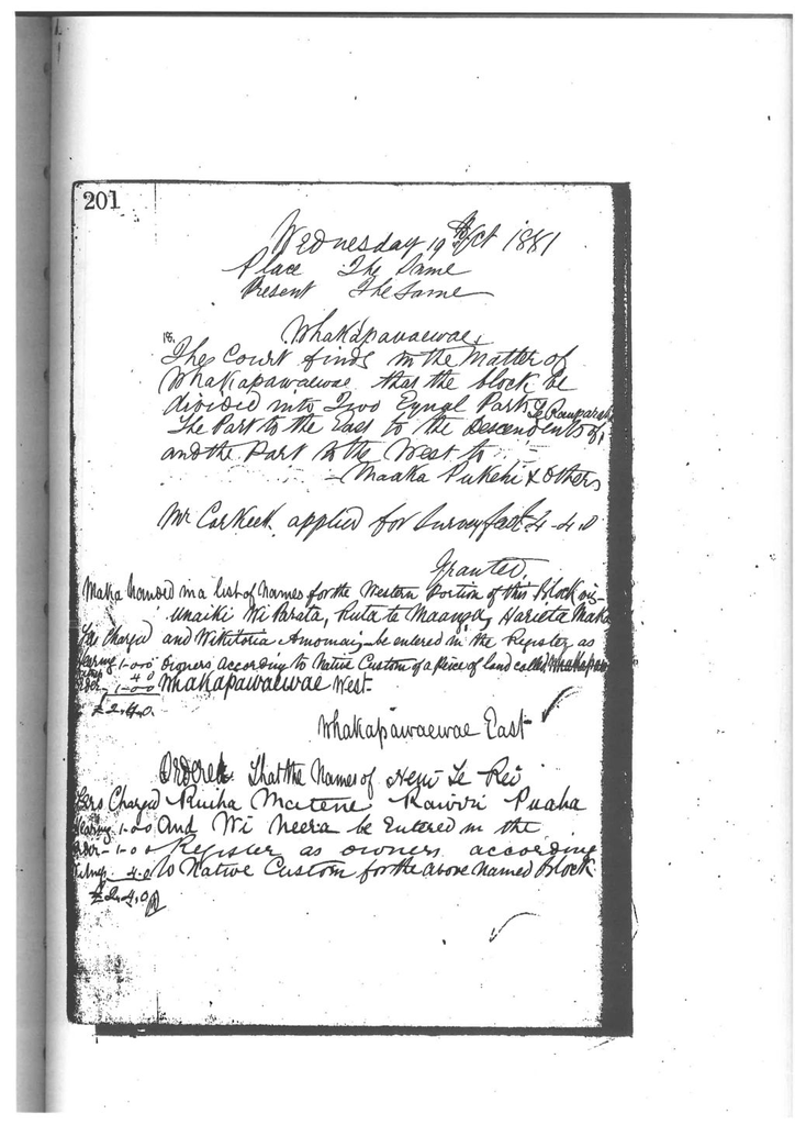 The court finds in the matter of Whakapauaewae that the block be divided into two equal parts. The part to the east to the descendents of Te Rauparaha and the part to the west to Maaka Pukehi and others