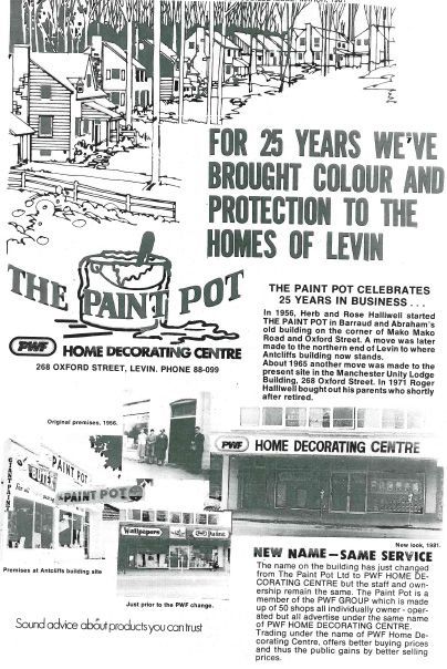 In 1956, Herb and Rose Halliwell started THE PAINT POT in Barraud and Abraham's old building on the corner of Mako Mako Road and Oxford Street. A move was later made to the northern end of Levin to where Antcliffs building now stands. About 1965 another move was made to the present site in the Manchester Unity Lodge Building, 268 Oxford Street. In 1971 Roger Halliwell bought out his parents who shortly after retired.NEW NAME-SAME SERVICE