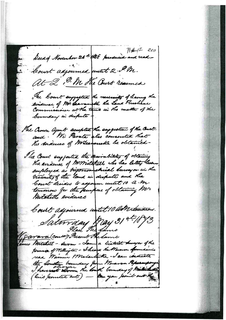 Court decided to adjourn the court until 12 o’clock on Monday next the 2nd June in order to give the crown agent an opportunity of coming to an arrangement with Wi Parata and the Ngati Awa tribe.