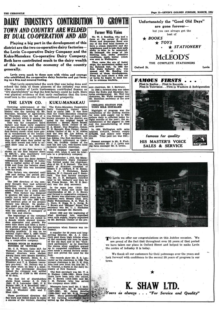 Playing a big part in the development of this district are the Co-operative dairy factories - The Levin Co-operatve Dairy Company and the Kuku-Manakau Co-operative Dairy Company. Both have contributed much to the dairy wealth of this area and the economy of the country generally.