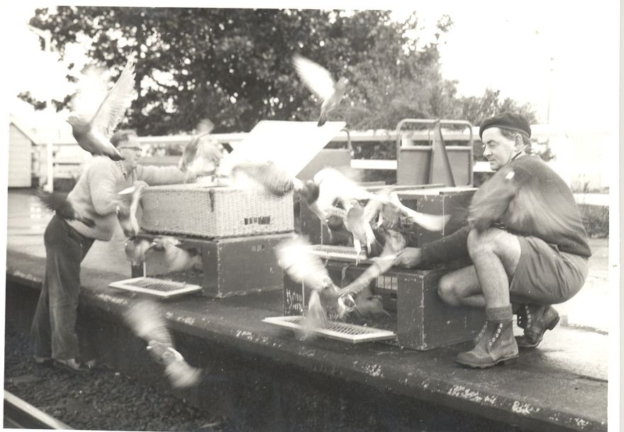 Birds are being released from their travelling baskets/cages by Mr W. Aitken & Mr T. Atkinson, on the platform at Levin Railway Station.