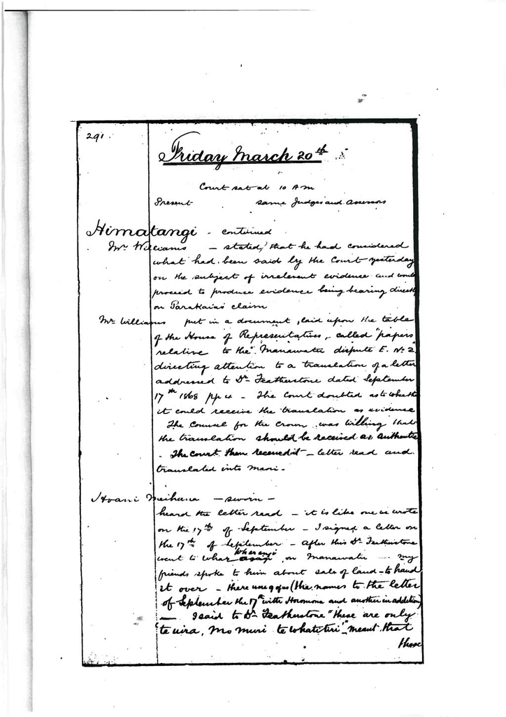 Mr. Williams put in a document, laid upon the table of the House of Representatives, called “papers relative to the Manawatu dispute E. No. 2” directing attention to a translation of a letter addressed to Dr. Featherstone dated September 17th 1868 pp 4. The court doubted as to whether it could receive the translation as evidence.
