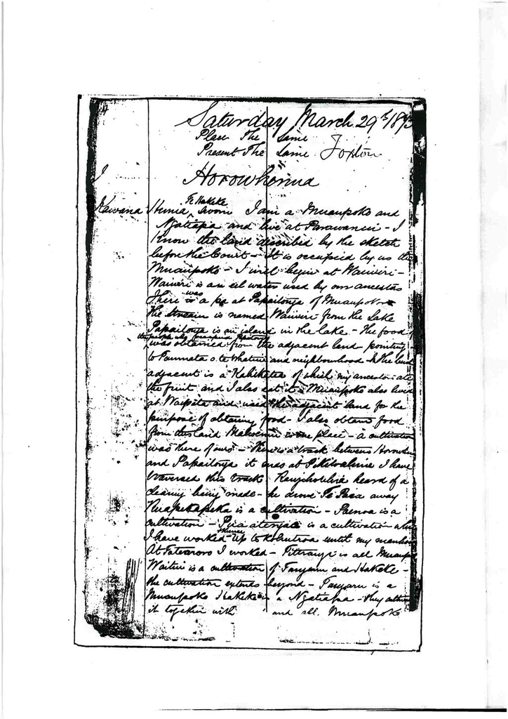 All the pas in the islands were occupied by Muaupoko. Atapuata and Moana Karapu are not now – uninhabited. The people now live on the line. They were occupied up to the time of Mr. Hadfield’s arrival (1839). The stumps are still standing. They belonged to our ancestors. They were ornamented pas and when falling into decay – were restored again by Muaupoko. They have never been in the possession of anybody but us.