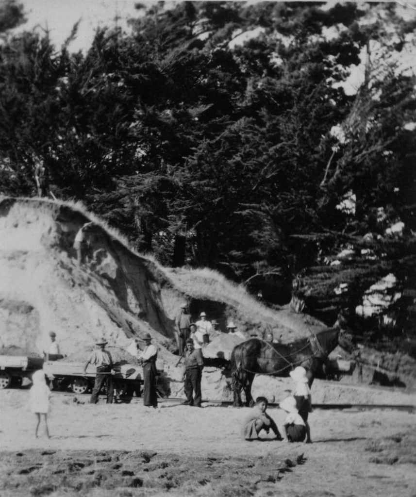 A horse and cart being used by a number of men who are clearing a sandhill for the Woolpack and Textiles factory site 1933.