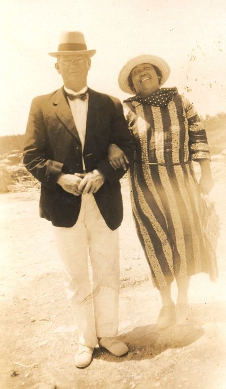 A happy couple. Gentleman is wearing white trousers and shirt with bow tie and dark jacket. Lady is wearing a striped dress, kneck scarf and hat.