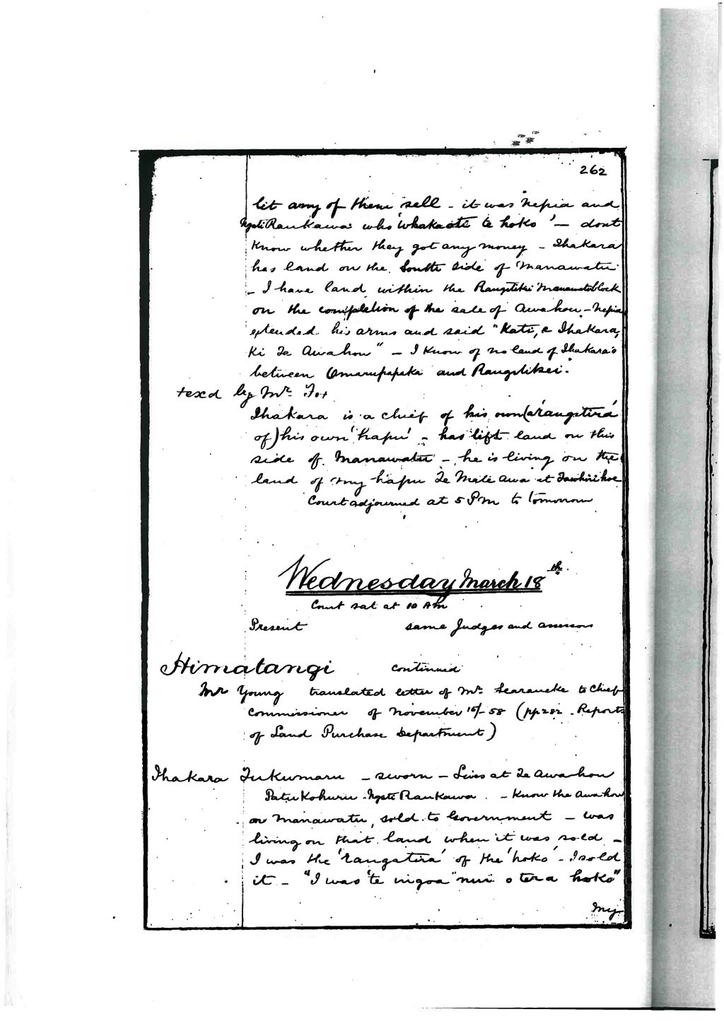 I was the rangatira of the ‘hoko’. I sold it. “Iwas ‘te ingoa” nui o tera hook”. My hapu was living at Te Awahou when it was sold. Ngatiraukawa did not at first assent. Long time discussing it before it was settled, ‘no te roa o te tohenga ka whakaae’.