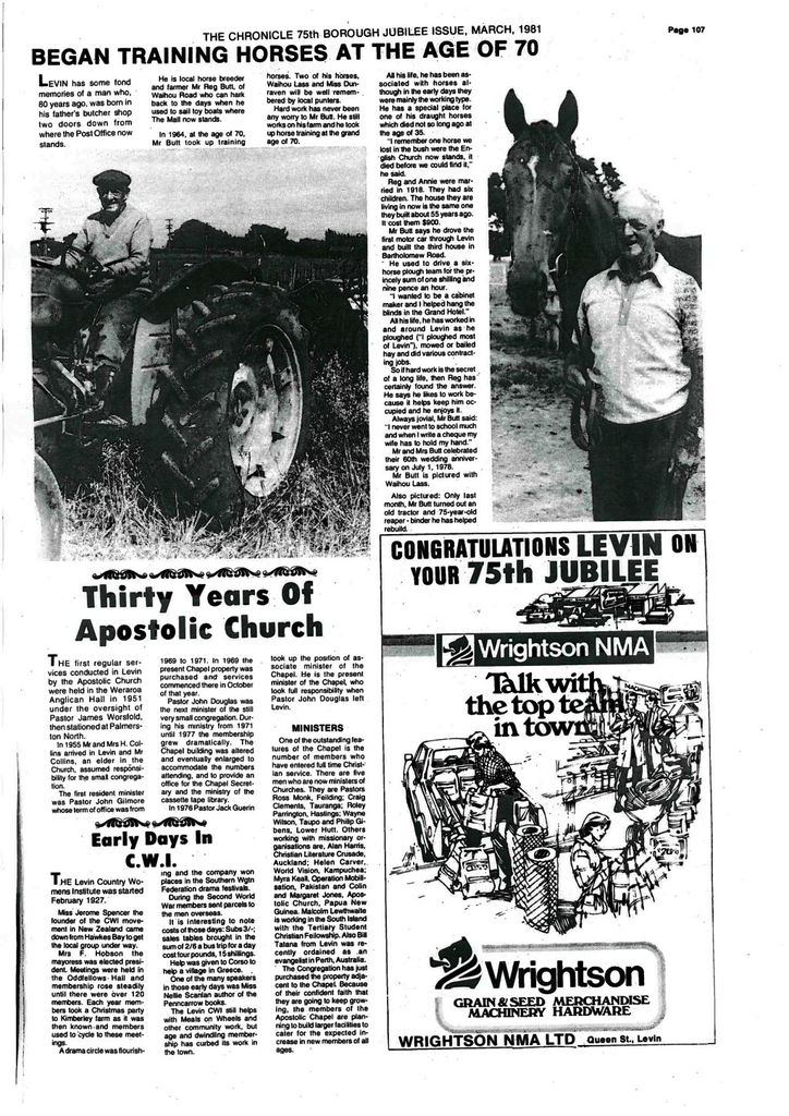 The first regular services conducted in levin by the Apostolic Church were held in the Weraroa Anglican Hall in 1951 under the oversight of Pastor James Worsfold, then stationed at Palmerston North.