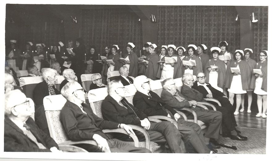 Nurses from Levin Hospital & Training School on their annual visit to Levin War Veterans Home. Nurses are holding lighted candles and probably singing Christmas Carols.