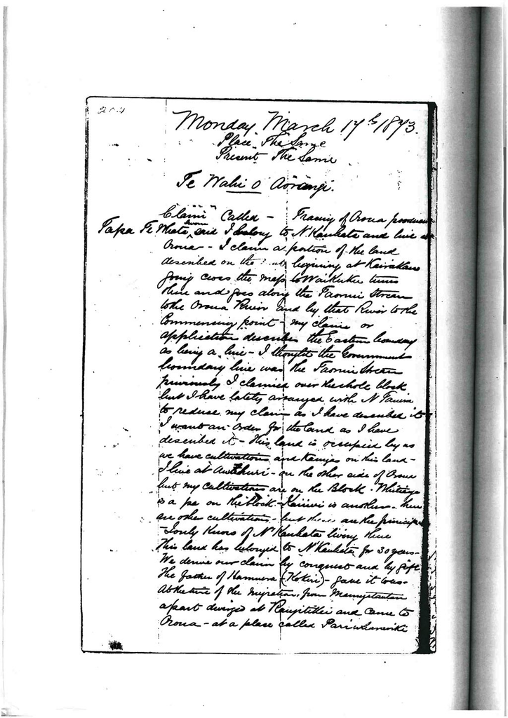 Tapa Te Whata: Sworn I belong to Ngati Kauwhata and live at Oroua I claim a portion of the land described on the map begining at Kairakau? going across the map to Waikuku? turns there and goes along Taonui stream to the Oroua River and by that river to the commencing point, My Claim or Application describes the eastern boundary as being a line. I thought the Governments boundary line was the Taonui Stream. Previously I claimed over the Whole Block but I have lately arranged with Ngati Tauira to reduce my claim as I have described it, I want an order for the land as I have described it. This land is occupied by us, We have cultivations and Kainga's on this land. I live at Awahuri on the other side of Oroua but my cultivations are on the block. Whitianga is a Pa on the block Kairiri? is another there are other cultivations but these are the principle I only know of the Ngati Kauwhata living there, this land has belonged to Ngati Kauwhata for 30 years. We derive our claim by conquest and by gift, the father of Hamuera (Kokiri) gave it to us. At the time of the Migrations from Maungatautari a part diverged at Rangitikei and came to Oroua at a place called Pariwharariki? where we made some prisoners, we arrived at Kiwitea? and attacked the village the people ran away Kiwitea? is not within the boundaries of the land I defined. We then crossed over the river on to this land and came to a village we made prisoners of these people I have forgotten the name of the village, we did not kill the people of Pariwharariki? only one man was killed he was a bad man the people of the second village were spared likewise we followed the course of the Oroua to Manawatu to the village of Tuwhakatupua where we killed the people, we killed these people at the desire of the other people of this block with whom they were at envy. We then went on making raids on the villages on our way down the Manawatu River. We returned with the prisoners we had taken at Te Rotonuiahau where we sat down, we found some people there and we were addressed by Kokiri the father of Hamuera who said "The only dowry I have to give with my daughter are the two places Whakaari and Aorangi" this was addressed to Ngati Kauwhata, this was given as payment for returning his daughter and we the Ngati Kauwhata remained and occupied the land we have remained in possession from that time.