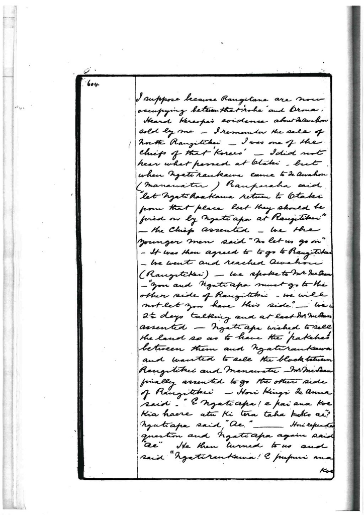 I was quite clear when I sold Te Awahou that Ngati Apa had no claim. I had a reason for urging the sale of Te Awahou. North Rangitikei was sold by assent of Ngati Raukawa. Then Te Hirawanu proposed to sell all the land between Manawatu and Port Nicholson.