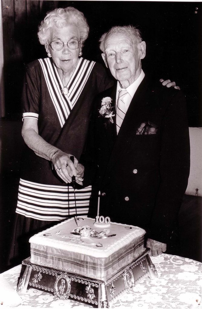 Eric Beveridge and wife cutting his 100th birthday cake.