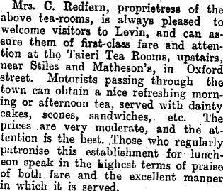 Mrs. C. Redfern, proprietress of the above tea-rooms, is always pleased to welcome visitors to Levin, and can assure them of first-class fare and attention at the Taieri Tea Rooms, upstairs, near Stiles and Matheson's, in Oxford street. Motorists passing through the town can obtain a nice refreshing morning or afternoon tea, served with dainty cakes, scones, sandwiches, etc. The prices are very moderate, and the attention is the best. Those who regularly patronise this establishment for luncheon speak in the highest terms of praise of both fare and the excellent manner in which it is served.