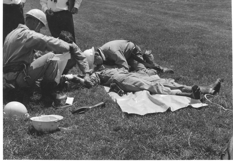 ‘Resuscitation’ part of Linesman Competition, late 1970’s 3 men giving first aid to the ‘electrocuted’ man, observed by 2 judges. Competion believed to have taken place at Levin Racecourse.
