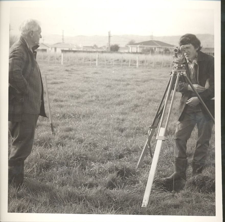 Mr C. Horn & Mr M. Olson, surveyors, at Levin Intermediate School checking an acre for playing fields. 1 B&W photo print