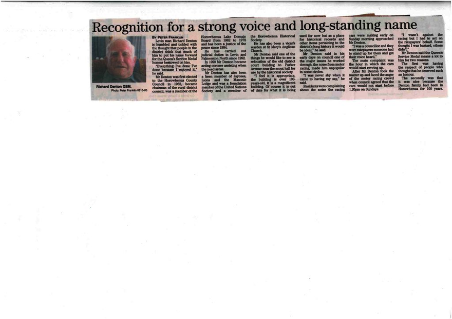 Mr Denton has also been a keen member of Jaycees, Lions and the Masonic Lodge and was a foundation member of the United Nations Society and a member of the Horowhenua Historical Society.