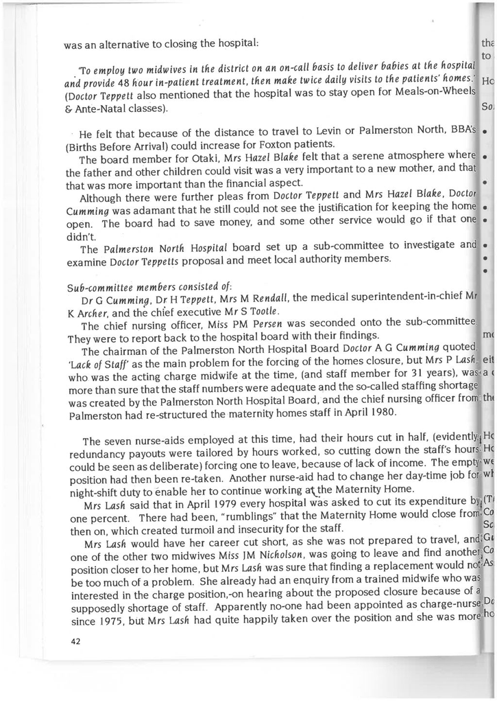 The chairman of the Palmerston North Hospital Board Doctor A G Cumming quoted, 'Lack of Staff' as the main problem for the forcing of the homes closure, but Mrs P Lash, who was the acting charge midwife at the time, (and staff member for 31 years), was more than sure that the staff numbers were adequate and the so-called staffing shortage was created by the Palmerston North Hospital Board, and the chief nursing officer from Palmerston had re-structured the maternity homes staff in April 1980.