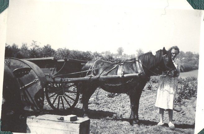 Rural scene, horse and cart with a woman standing at the head of the horse. Rural agricultural.