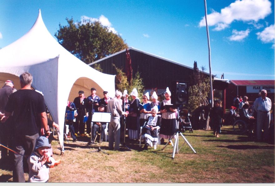 Group in Dutch dress at opening of De Molen setting up speakers Dodeel B. Flax stripper museum in back.