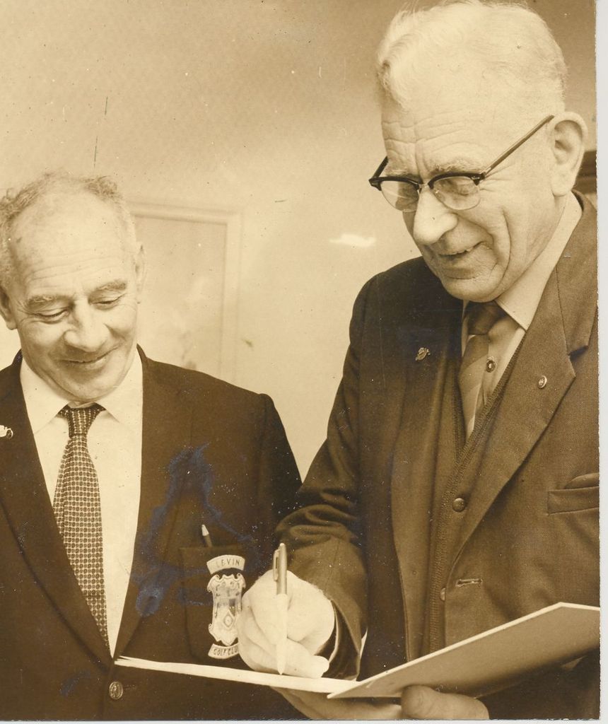 Mr A.S. Atkins (left) watches as Mr W.G. Clark (right) signs the petition which will request the Levin Borough Council to name a playing field after the late Mr W. Donnelly. 1 B&W photo print