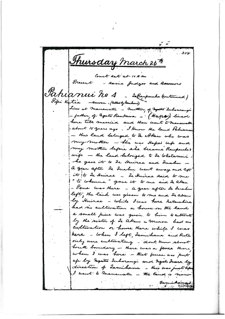 Pahianui no4 – Te Rauparaha (continued)Pipi Katea – sworn (called by Tamihana) – lives at Manawatu – mother of Tuhourangi – father of Ngatiraukawa – (hape) lived here till married and then went to Manawatu about 15 years ago – I know the land Pahianui – this land belonged to Te Akau who was my mother – she was Hape’s wife and my mother before she became Rauparaha’s wife – the land belonged to Te Whatanui – he gave it to Te Huirae and Tuahau – a year after Te Tuahu went away and left it to Te Huirae – Te Huirae said to me “to whenua” gave it to me and Te Akau – Pene was there – a year after Te Tuahu left, the land was given to me and Te Akau by Huirae – while I was here Natanahira had no cultivation or house on the land – a small piece was given to him to cultivate by the sister of Te Akau – Ururoa had no cultivation or home there while I was here – when I left, Tamihana and Ruta only were cultivating – don’t know about south boundary – there was a fence there when I was here – that fence was put up by Tuhourangi and Ngati Tuara by direction of Tamihana – this was just before I went to Manawatu – the land is now